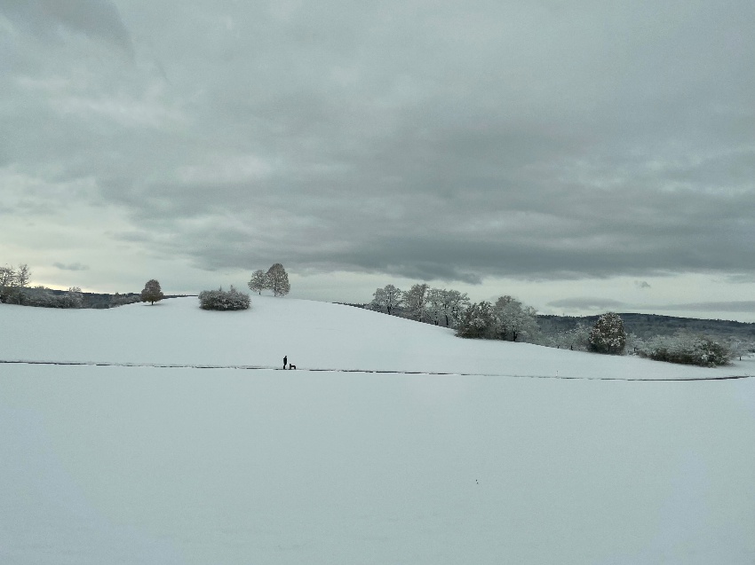 地主の菜園から老夫婦の戸口へとつづく雪上の足跡、明け方から降りしきる新雪はしづかに消してゆく。