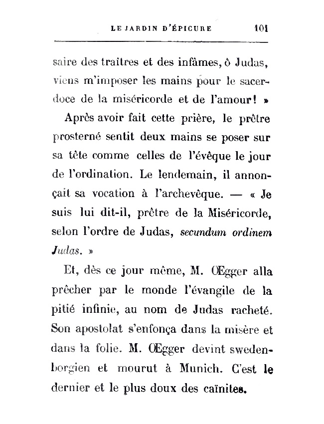Et, dès ce jour même, M. Œgger alla prêcher par le monde l'évangile de la pitié infinie, au nom de Judas racheté. Son apostolat s'enfonça dans la misère et dans la folie. M. Œgger devint swedenborgien et mourut à Munich. C'est le dernier et le plus doux des caïnites.