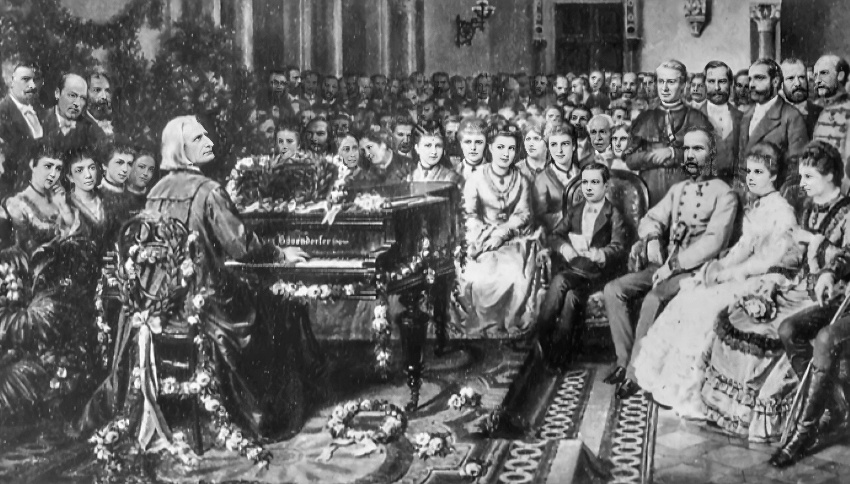 The Hungarian pianist, composer and great thirsty soul Franz Liszt (1811-86) playing recital to Emperor Franz Joseph in Budapest - on a Bösendorfer grand piano decorated with flowers.
